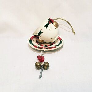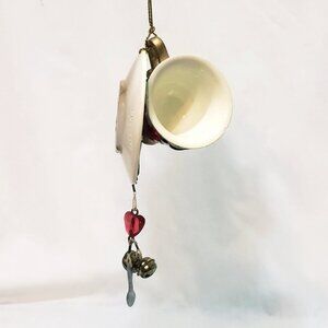 Tea Cup Saucer Spoon Bells Heart Christmas Ornament 1.5" UDC 2003 Resin Chipped