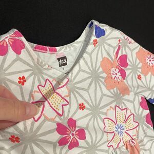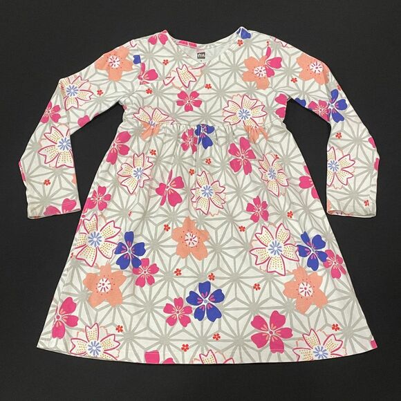 Orig $39. Adorable TEA Long Sleeve Wrap Neck Dress dress in a sweet, springy floral pattern, with pinks, grays/greys, purple, white, peach. Girl's Kid's size 5. 100% soft cotton; stretchy, breathable and so comfy. Perfect for spring, cool summer evenings, and fall. Comfortable enough for moving around/sitting at school, comfy all-day play, church, parties, or lounging at the house.