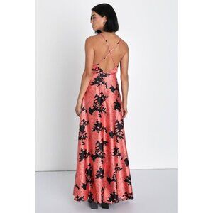 Get date night ready in the perfectly sexy, Lulus Tea Gardens Rusty Rose Floral Print Satin Maxi Dress! Sleek satin fabric, with a black floral print, cascades from adjustable skinny straps into a sultry surplice bodice, and a fitted waist, with sash belt. Full maxi skirt. Hidden back zipper/clasp.