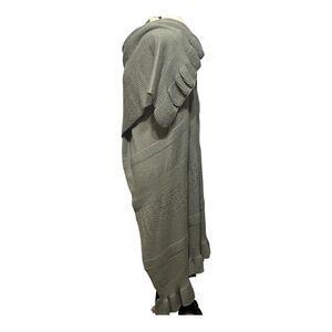 The Tea Green Open Ruffle Pointelle Knit Wrap Shawl is a versatile, feminine accessory with a lightweight, breathable green knit fabric. It has delicate ruffle detailing, a generous size, and can be worn casually draped over the shoulders or elegantly wrapped around the body. This shawl adds a unique and stylish touch to any outfit.