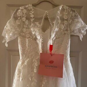 Tea Length Sleeves Modern A-Line V-Neck Button Back Wedding Dress / Size US 4