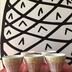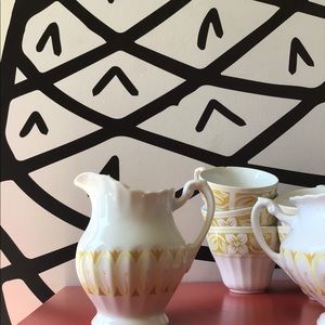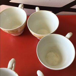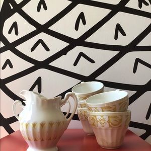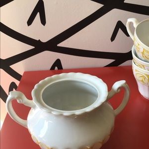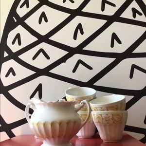 Vintage style Tea set comes with 5 cups, 1 small pitcher, 1 sugar container but please note there’s no top for the container. There are some signs of wear, notice the discoloration on the bottom of the one of the cups. There’s a crack along the ridge of another cup. Take a moment to review all pictures before placing your bid.