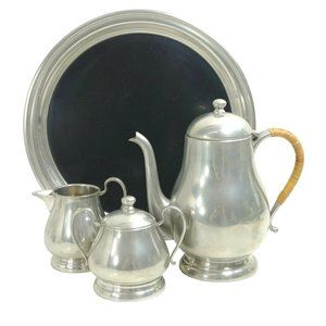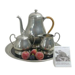 This is a Handmade Danish Quality Pewter Queen Art Tea Set. Pot Tray Sugar Creamer.