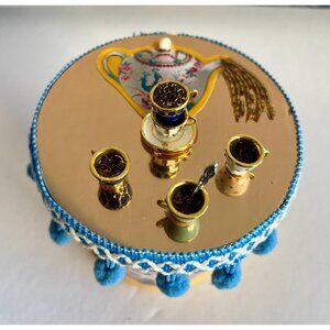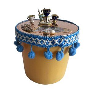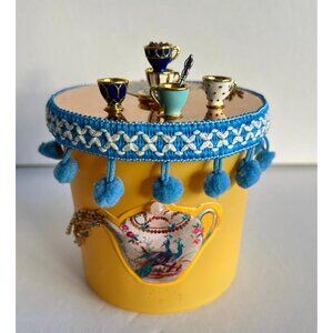 Tea Time Yellow Whimsical Decorative Container Jar Handcrafted Upcycled Assemblage Art Tea Time Yellow Whimsical Decorative Container - Tea Caddy Bag Storage - Gift for Tea Lover - Teapot Tea Cups - Yellow Blue Canister