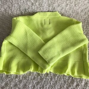 Color kiwi, scoop neck, long sleeves, button closure, knit construction, ruffled trim, 100% cotton