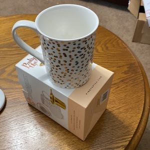 This cup has gold and silver dots all over. It is brand new. It has a little cup to put your tea bag in and it also has a lid to let young tea set for a few minutes.