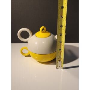 Tea for One Tea Pot with Cup Set Stackable Yellow and Gray Retro Colorful