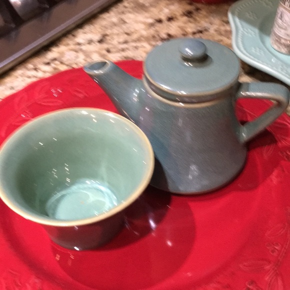 It’s a 3 piece set. No chips. Tea pot sits on teacup. Beautiful teal with light color trim.
