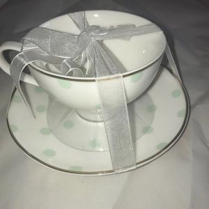 A very pretty newer Royal Albert by Meritage teacup and saucer. Soft, feminine colors. White with mint green polka dots and gold trim.