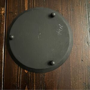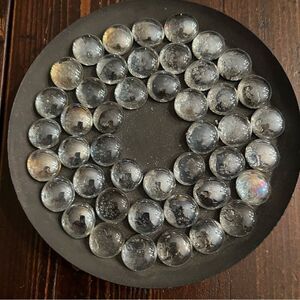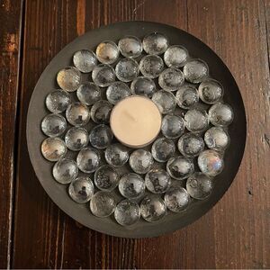 This item is a handmade tea lite holder. This item has a black metal base with three legs. The top is covered with clear glass stones. There is a space for a tea lite. (One comes with the item.) The item is 6 1/2” across. This holder will be a great addition to your decor either inside or out.