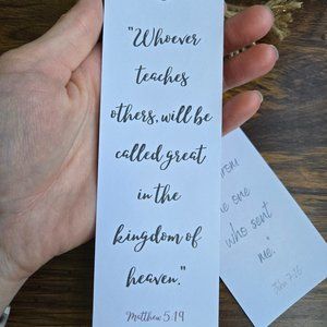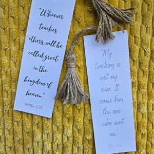 Struggling to find a teacher gift for that awesome educator in your child's life? Whether it's for Teacher Appreciation Week or a cute little end of school year gift, this Biblical Bookmark is the perfect way to say "thank you" to that mentor that is paving the way for your child's future. Encourage them with something as simple as a bookmark. Teaching truly is HIS work! Matthew 5:19 and John 7:16 are just two verses from scripture that tugged at my heart that proves just that. Show your appreciation for all the hard work they do. Matthew 5:19 bookmark has gold accented twine tassel. John 7:16 bookmark has silver accented twine tassel.