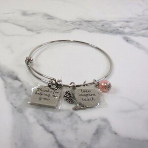 Show your appreciation with this elegant silver-toned teacher slightly stretchable bangle featuring a "Thank You for Helping Me Grow" charm, The other charm says: "Love Inspire Teach", a delicate tree charm, and a pink pearl bead. A meaningful and inspiring gift for teachers, mentors, and educators. 8 1/2" inner diameter.