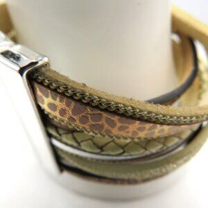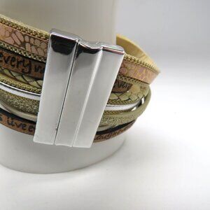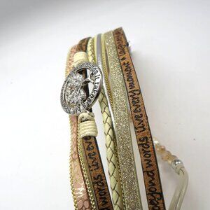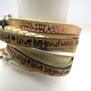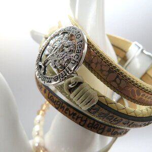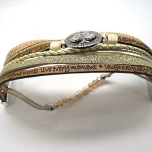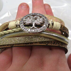 This elegant multi-layered bracelet features a tree of life charm and inspirational quotes 'it takes a big heart to teach little minds'. Crafted with various leather textures, it adds a stylish touch to any outfit. Preowned