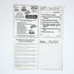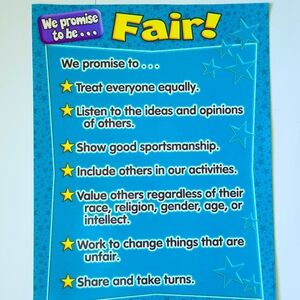 -- Turquoise blue "We Promise to Be Fair" behavior poster. Back has worksheet templates. Gently used (minor tear/spot). 22" x 17"