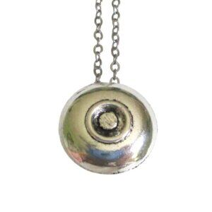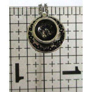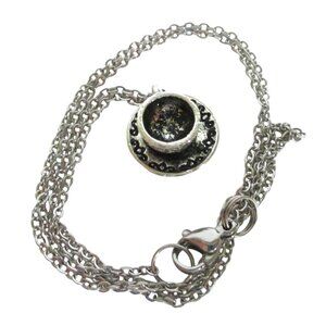 This teacup and saucer pendant necklace showcases a vintage-inspired design with a silver-tone finish. Its intricate detailing makes it a notable accessory, blending charm and elegance into one unique piece.
