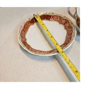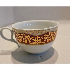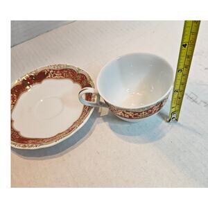 Teacup and Saucer Andrea by Sadek Winterthur porcelain Red Gold collector. Produced by Andrea by Sadek in collaboration with the Winterthur Museum, Garden and Library. Reproduction or adaptation of historical design from Museum's collection. No chips, crazing, or fleabites. Collector's piece kept in glass china cabinet.