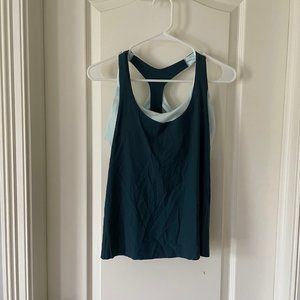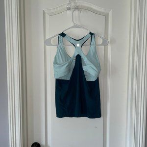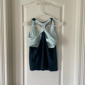 Dark Teal overtank, with light blue/green built in sports bra. Size M. Loose fitting and fabric is sweat wicking. Only been worn 2 times.