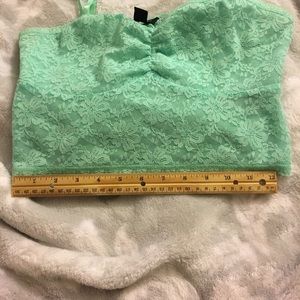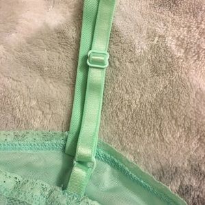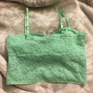 Lace teal green bandeau size medium. Soft lace, adjustable straps but not removable. Sweetheart breastline. Thin polyester fabric so you can wear under your favorite top!
