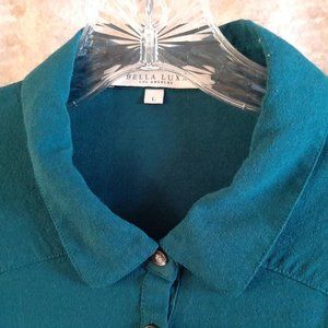 Good used condition teal colored button down blouse with long sleeves. 100% viscose.