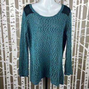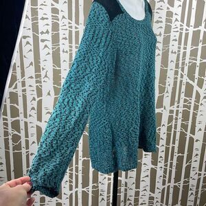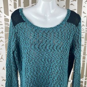 Teal & Black Tie Back Sweater Plus sz 1. Features a loose knit, semi-sheer cotton blend in shades of teal and black with some subtle shiny black threading woven in, boat neckline with V in the back and a knitted tie across the shoulders, banded ribbed knit neckline, cuffs & hemline, longer fit. Gently worn and laundered with some light pilling/wash wear but no flaws to note.