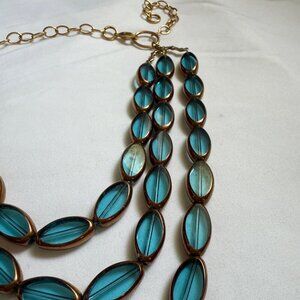 💙 Teal Blue Beaded Statement Necklace 3-Strand Gold Hardware