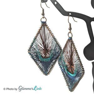 Large rhombus shaped brass tone dangle earrings accented with a blue, teal and brown threaded pattern.