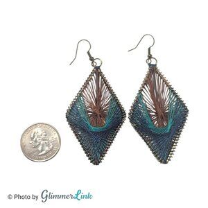 Large rhombus shaped brass tone dangle earrings accented with a blue, teal and brown threaded pattern.