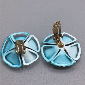 Teal Blue Enamel Flowers Earrings Clip On Flower Power 70s Fun Colorful Jewelry