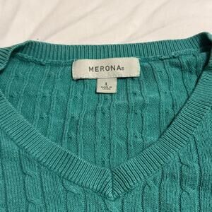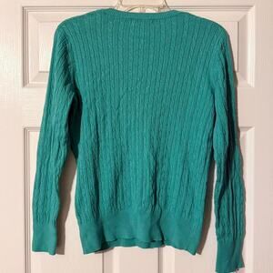 2009 teal cable-knit sweater with a V-neck and full sleeves. The ribbed hem and cuffs hold their shape, and the fit sits right at the hip with a slightly fitted, flattering look.