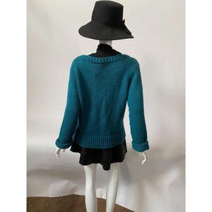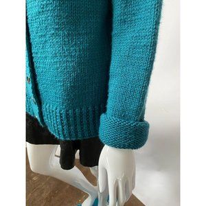 A gently worn sweater that has nice long sleeves that you can roll up, or leave long to keep you warm this winter. It is a very pretty teal color and doesn’t have tags but measures a large.