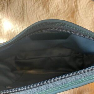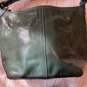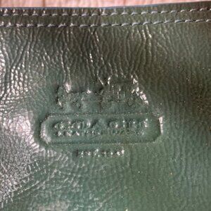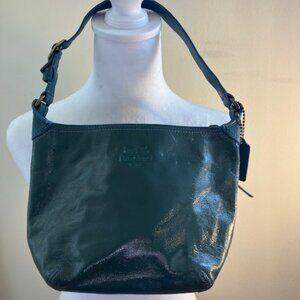 Teal/Green Patent Leather Coach Purse. Blue Adjustable Strap. White Stitching on Top and Along Strap. Coach Embossed Logo. Blue Satin Inside with Open Pocket. Coach Logo Key Tag. No. CO873-41561. Measures 11" wide x 8" long x 7" strap. Y2K Coach.