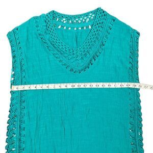 Stay stylish at the beach with this teal crochet swim cover-up. Perfect for adding a touch of elegance to your swimwear.