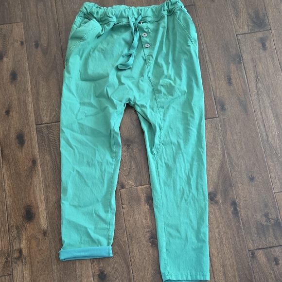 Stylish teal pants with a drawstring waist. Comfortable and casual.Made in Italy. Can feat L, XL