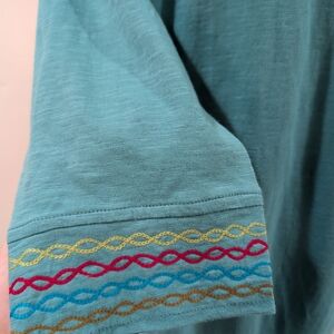 Beautiful teal tunic featuring vibrant floral embroidery. Perfect for a stylish and comfortable look.