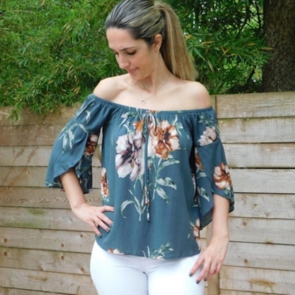Teal Floral Off Shoulder Top
