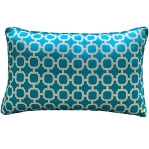 TAGS: teal geometric pillow, blue lumbar cushion, patio pillow, rectangle outdoor pillow, porch bench pillow, coastal home decor, upscale coastal decor, indoor outdoor performance fabric pillow, luxury performance pillow