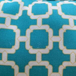 The teal and ivory diamond pattern offers a crisp, tailored look on fabric built for real use—indoors and out.