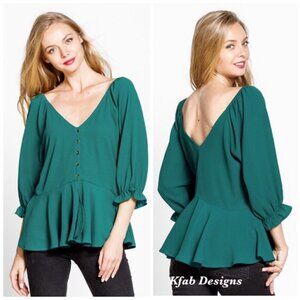 Teal Green Puff Sleeve V-Neck Button Peplum