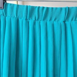 Pre owned teal pleated high low skirt in great condition with minimal flaws. Small snags at back of skirt as pictured. Worn only once. Beautiful, sheer, and flowy, perfect for date night or girls night. Skirt is lined.