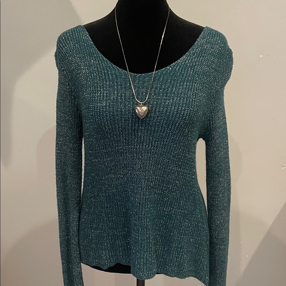 Stylish teal knit sweater featuring unique back . Perfect for a chic look.