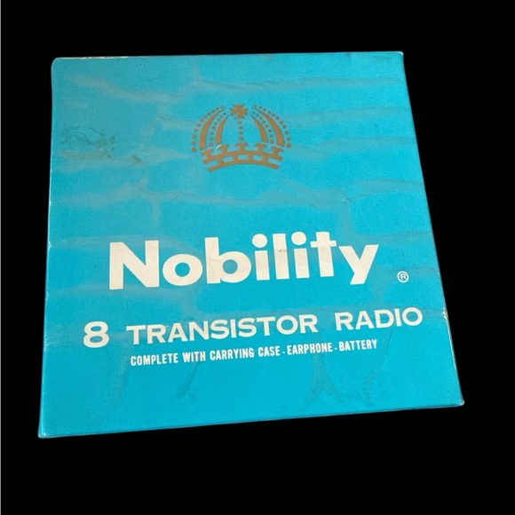 Nobility Model 832N transistor radio in vibrant teal. Includes warranty card.