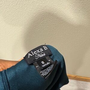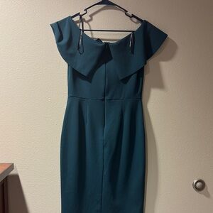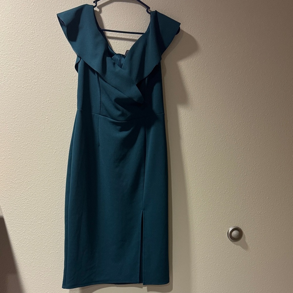 Elegant teal sheath dress with a flattering off-shoulder ruffle neckline. Tailored silhouette with a subtle front slit for easy movement. Perfect for weddings, cocktail events, or evening occasions. Teal color adds a sophisticated, modern touch.