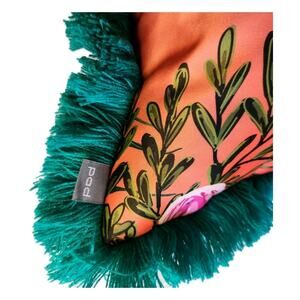 Absolutely Stunning 18"x18" Decorative Throw Pillow 21"x21" with teal fringe. Tropical palm, hibiscus, jasmine with Hummingbirds and color galore! Orange, Pink, Teal Green. In excellent pre-owned condition. Made by PAD home designs. Over $100 retail. Approximate weight is 2 lbs and 13 oz. Clean with no holes or stains. No odors or fragrances from a smoke-free home.