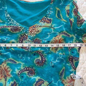 No tags for size or fabric. Beautiful georgette blouse has a lined bodice and sheer sleeves. Minor damage to the sparkle accent on front. See photos for measurements on length, pit-to-pit, waist, and sleeve length.