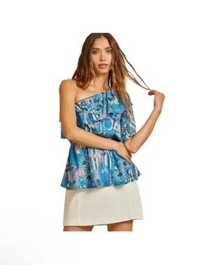 One-shoulder blouse with soft ruffle detail. Elastic waist for a relaxed fit. Printed teal fabric with light accents. Versatile for day or evening wear.