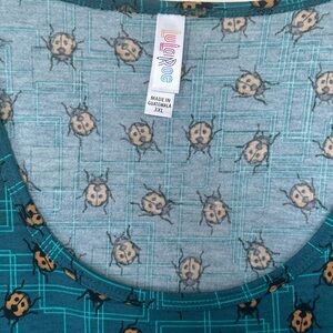 Stylish teal top with a unique ladybug pattern, perfect for any occasion. Comfortable and chic, this top adds a pop of color to your wardrobe.