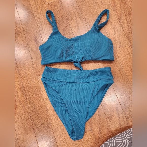Stylish teal ribbed bikini set. Features a knotted top and matching bottoms.