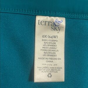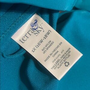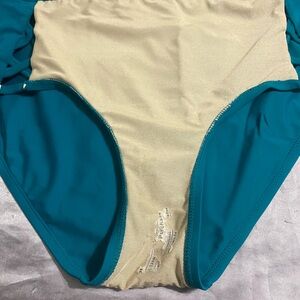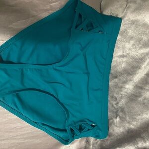Stylish teal bikini set with ruffled top and high-waisted bottoms. Features side cut-out details. Top is 1X (16W-18W), bottoms are Size 0X (14W) Washed but never worn