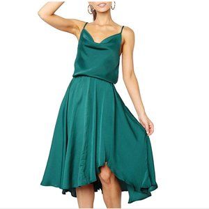 Cowl neck. Asymmetrical hem. Light comfortable fabric. Fit is true to size.