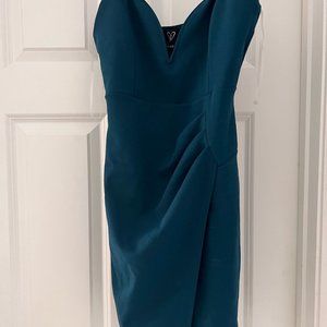 sexy mini dress features a plunging V neckline, adjustable spaghetti straps, a wrap-like skirt with pleated accents, and an asymmetrical hemline. Knit fabric offers a form hugging fit with plenty of stretch.